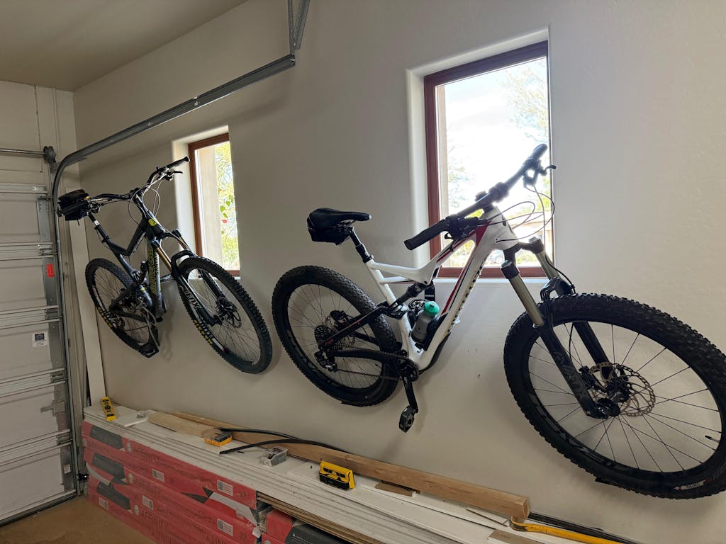 I habe a pretty small garage and a car hobby aside from MTB so space is limited, this solution was recommended to me from a friend and I can say its a perfect remedy if you cant hang bikes from the celing ( i cant with an 8ft celing in the garage )
